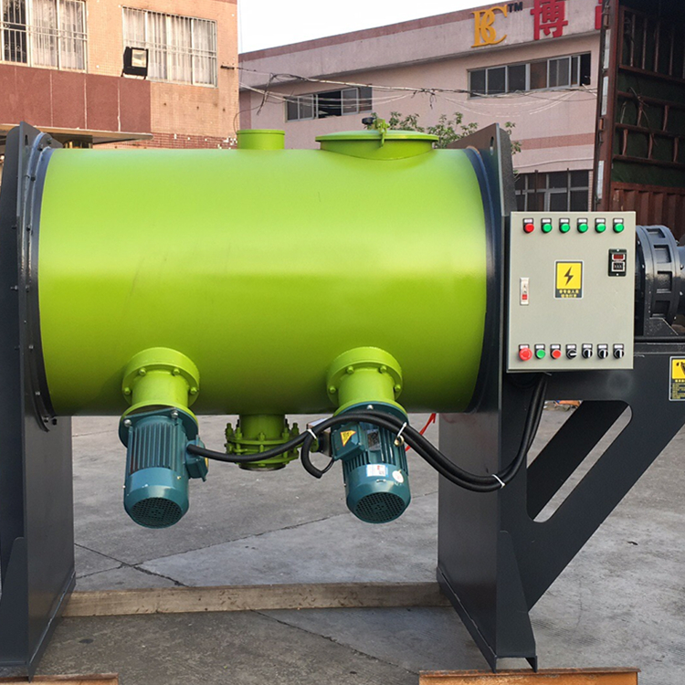 犁刀式混合機由主動減速機帶動犁刀組軸向運動,一方面將物料沿筒體圓周作徑向周向湍動,同時將物料沿犁刀兩側的法線方向拋出,另一方面被拋出物料經飛刀組時,被高速旋轉的飛刀剪切攪拌而強烈的拋散,物料在型刀和飛刀的復合作用下,不斷更疊、擴散。犁刀混合機的結構:主要由傳動部分、臥式筒體、犁刀組軸、飛刀組、出料閥、噴液裝置等部件組成。傳動部分:由主電機和減速機傳送給犁刀組軸。臥式筒體:上部設有進料口、觀察孔,筒體一側開有物料清洗門。犁刀組軸:犁刀根據容積大小安排犁刀數量,安裝在主軸上,在筒體內做圓周湍動流攪拌混合物料。飛刀組:副電機直接連接飛刀,高速飛刀有強烈拋散剪切的攪拌作用。出料闊:安裝筒體底部,供放料用。