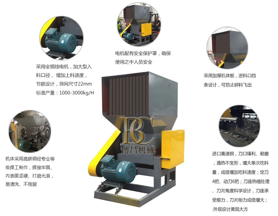 3、強力破碎機起動前,先用手轉動轉子,檢查一下齒爪、錘片及轉子運轉是否靈活可靠,破碎室內有無碰撞現象,轉子的旋轉方向是否與機箭頭所指方向一致,動力機及塑料破碎機潤滑是否良好。